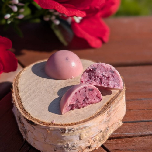バラの花びらのペーストと、ローズウォーターを練りこんだチョコレートは、ふわっと華やかで甘い香りが特徴です。バラのきれいな色を活かすため、上品な甘味のホワイトチョコレートを使用。優しくまろやかな味に仕上げました。